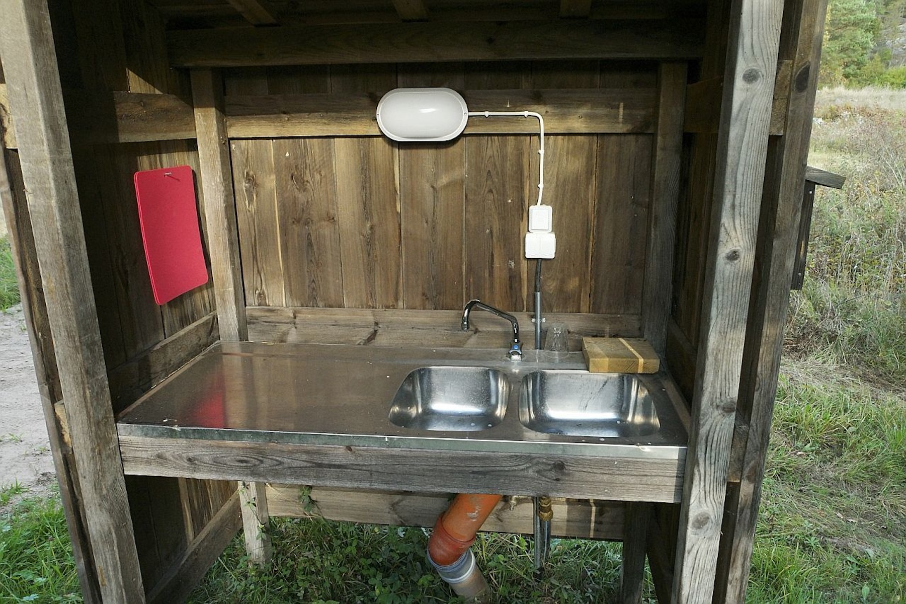 Hinter dem Wohnhaus der Vermieter, etwa 100 Meter entfernt, befindet sich ein Haus mit einer Holzsauna in einem Teil und im anderen Teil ein Zimmer mit einer Waschmaschine. Dieses "Servicehaus" wird mit einem anderen Ferienhaus geteilt, das etwa 200 Meter entfernt ist.