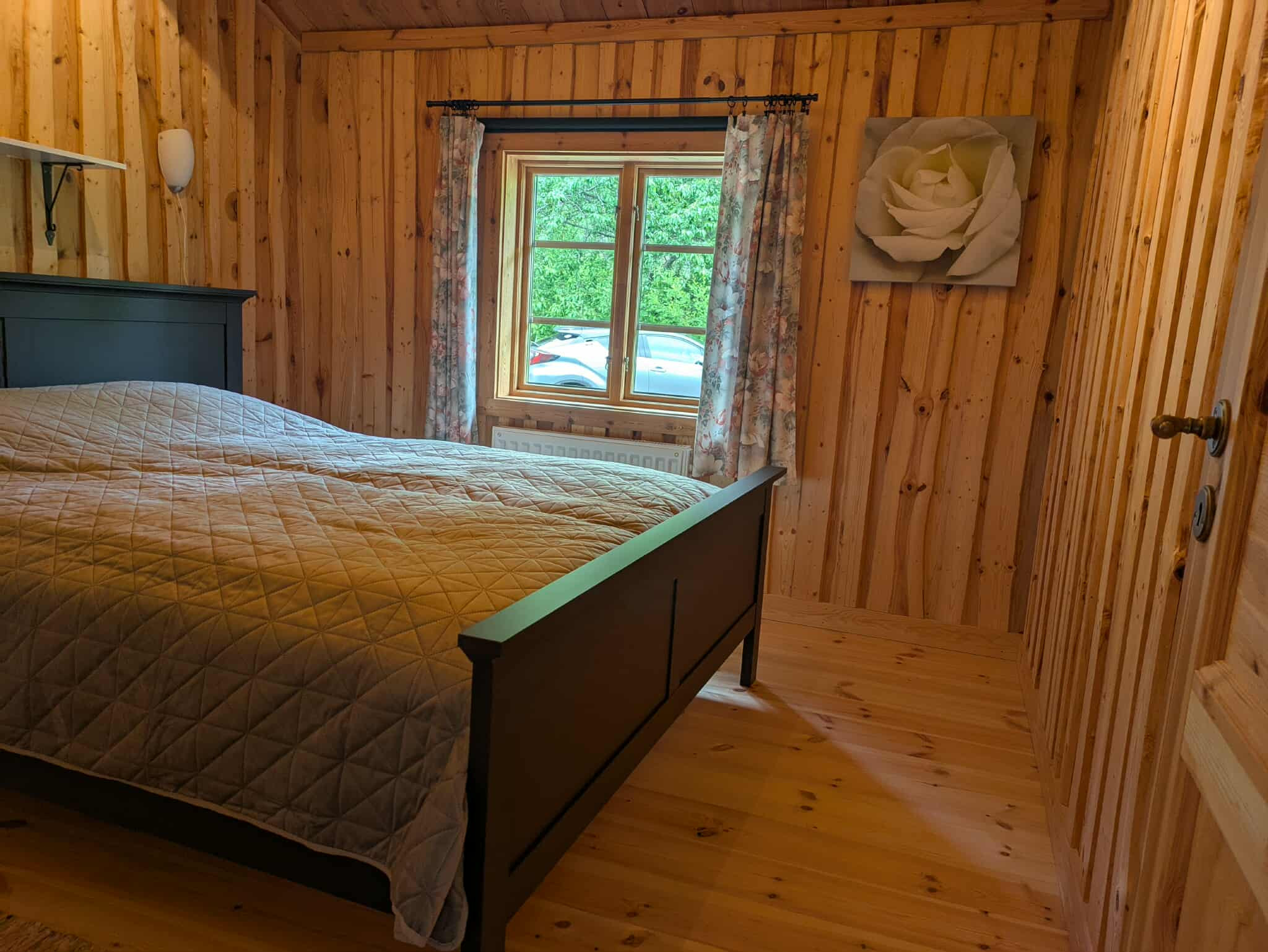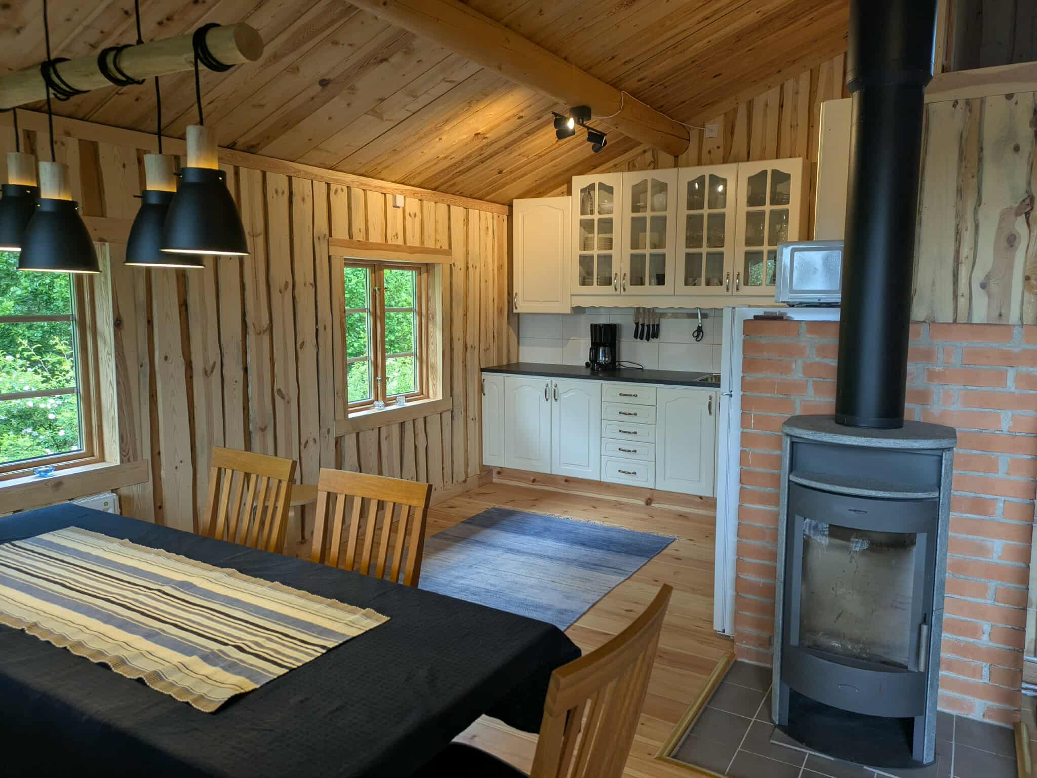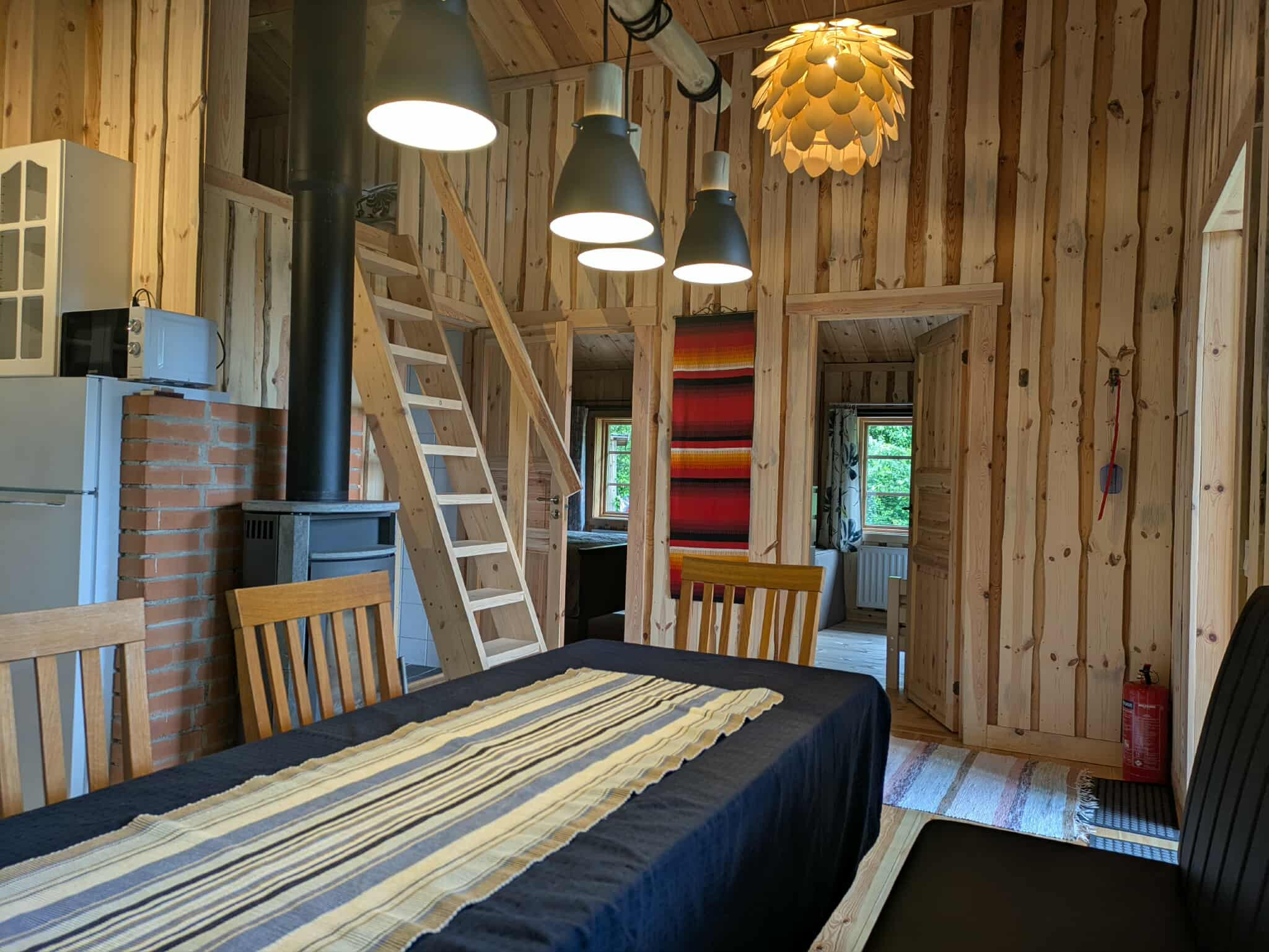 Das Haus verfügt über einen offenen Wohnbereich mit Küchenbereich sowie ein Wohnzimmer mit Kamin (Holz inklusive) und ein Sofa mit Fenstern zur Natur. Zwei Schlafzimmer sind miteinander verbunden, ein Zimmer mit zwei Einzelbetten und ein Zimmer mit Doppelbett. Neben den Schlafzimmern gibt es ein Badezimmer mit WC, Dusche und Waschbecken. Vom Erdgeschoss führt eine Treppe zu einem Schlafboden mit zwei Zustellbetten in Form von Matratzen.