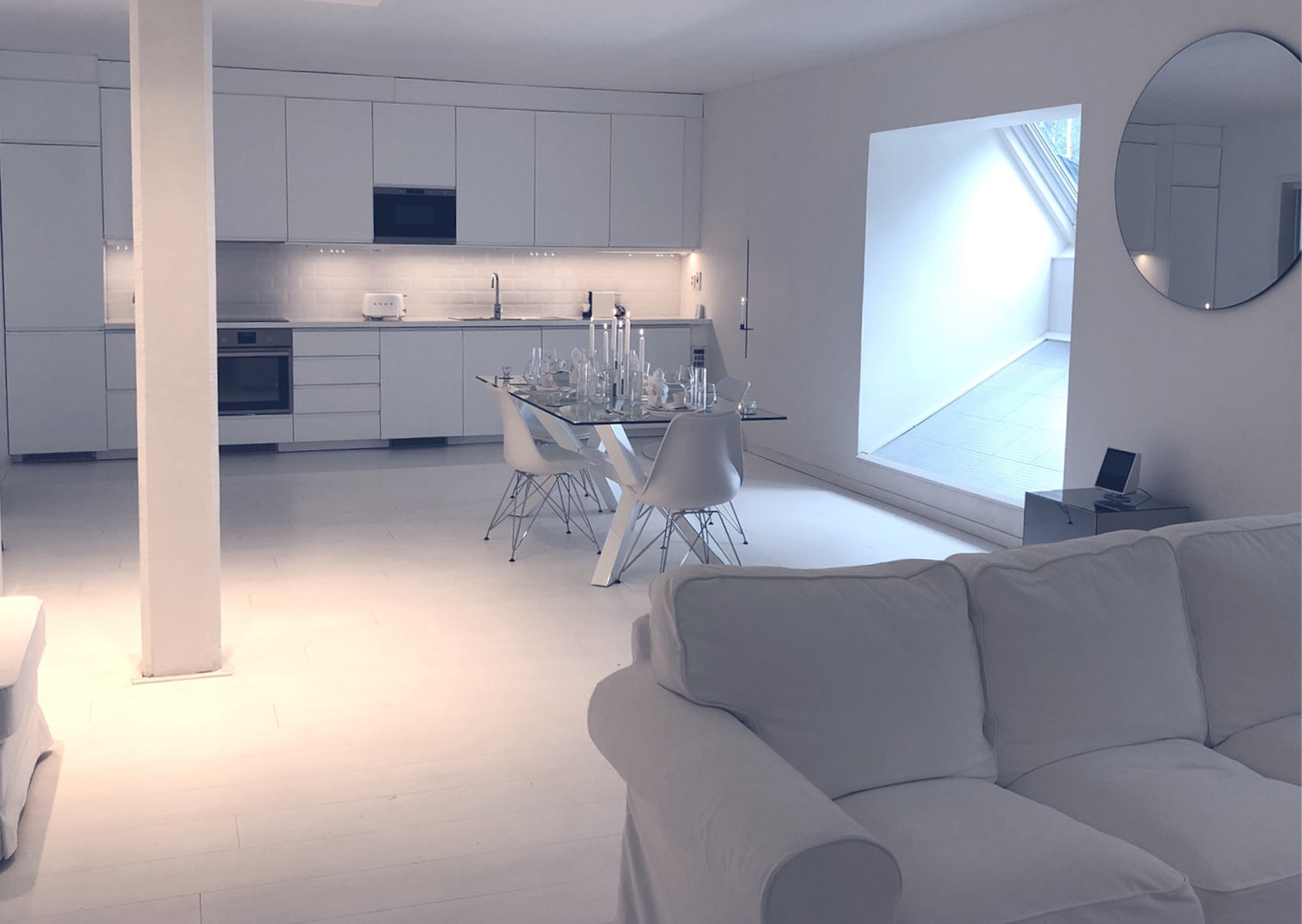 In einem wunderschön renovierten historischen Schulgebäude vereint diese Wohnung skandinavischen Charakter mit modernem Komfort.