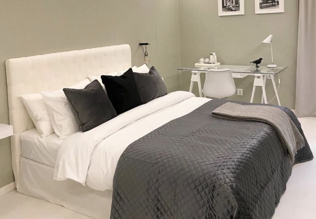 Hauptapartment (52 m²): Befindet sich im Erdgeschoss, mit einem Schlafzimmer mit einem Queensize-Bett, einem geräumigen Wohnzimmer mit Sofas und TV, einer voll ausgestatteten modernen Küche und einem Badezimmer mit Dusche und Badewanne.