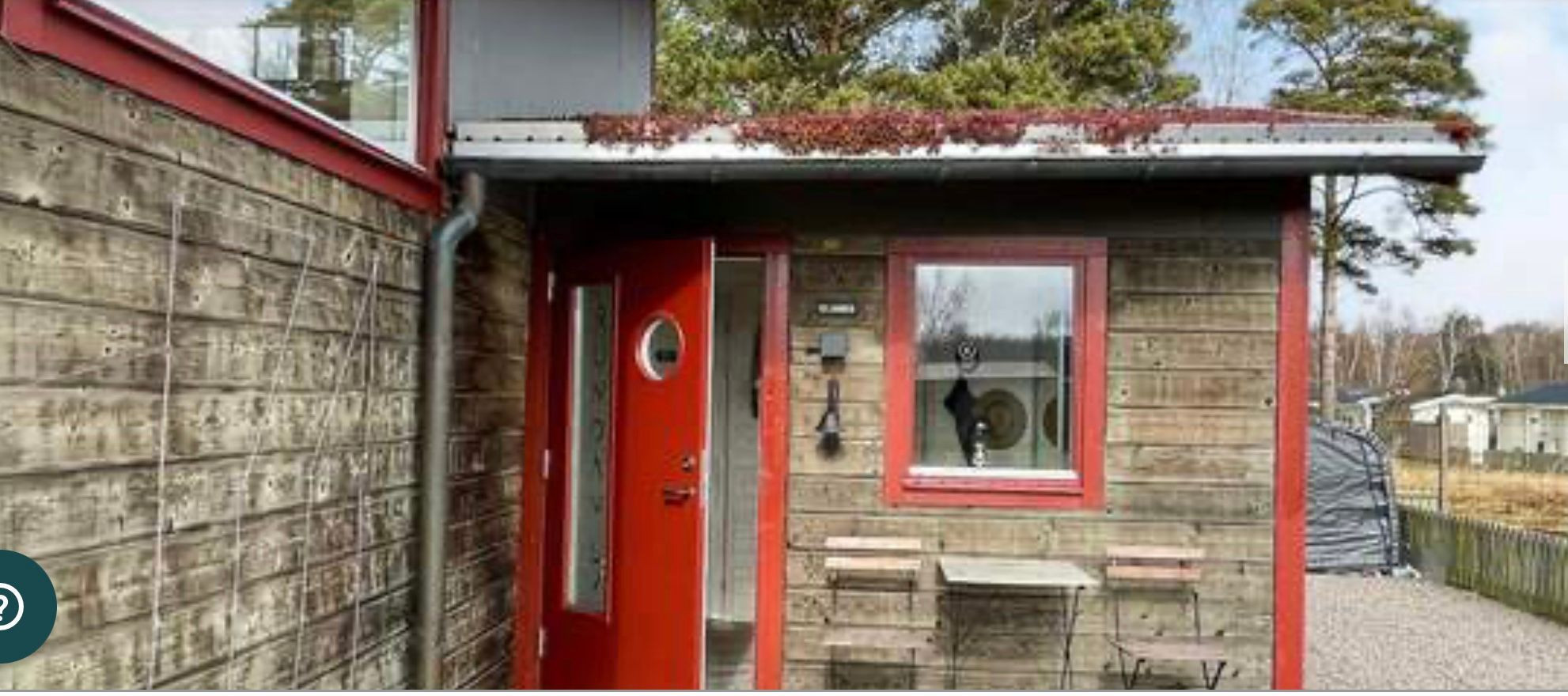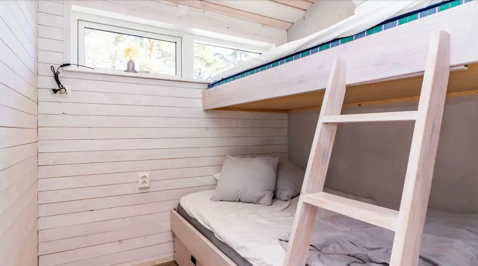 Das kleine Haus hat 1 Zimmer mit Doppelbett unten sowie einem 90-cm-Etagenbett darüber.