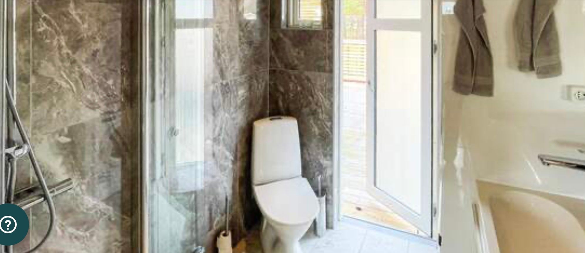 Beide Häuser haben Küche, Toilette, Dusche und Geschirrspüler. Im größeren Haus befinden sich Waschmaschine und Trockner. Alle Modernitäten sind vorhanden. Große Terrassenflächen rund um das Haus. Keine Erholungs-/Spielflächen auf dem Grundstück im Übrigen.