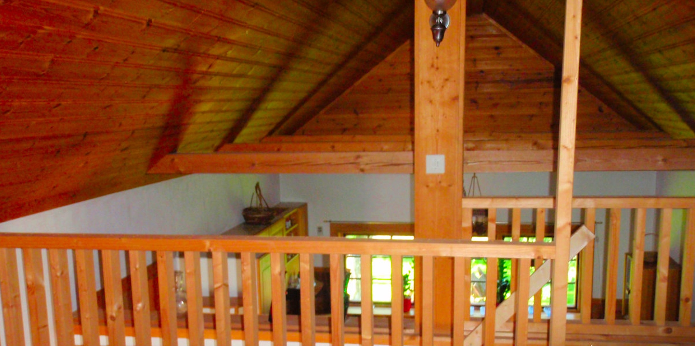 Über die Treppe gelangt man zum Schlafboden, der mit einem breiten Doppelbett (180 cm) komfortable Schlafplätze für zwei Personen bietet.