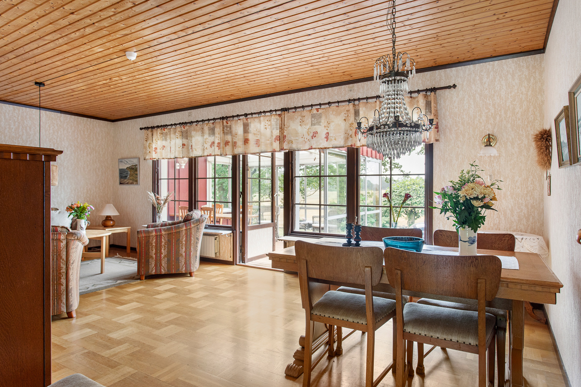 On the property, there is also a double garage and two parking spaces by the house. To get to the house, you drive past a horse paddock where you might be greeted by proud horses if you're lucky. At the back on the terrace, you look out over meadows where red deer or even the occasional moose are not uncommon visitors.