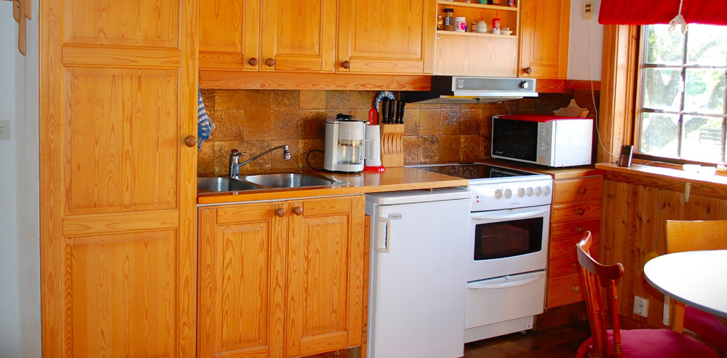 The living room with kitchen is fully equipped with electric stove, refrigerator, coffee maker and microwave. A nice dining area with a view of the garden complements the living room. The sofa bed (130 cm) provides sleeping space for 2 people/children.