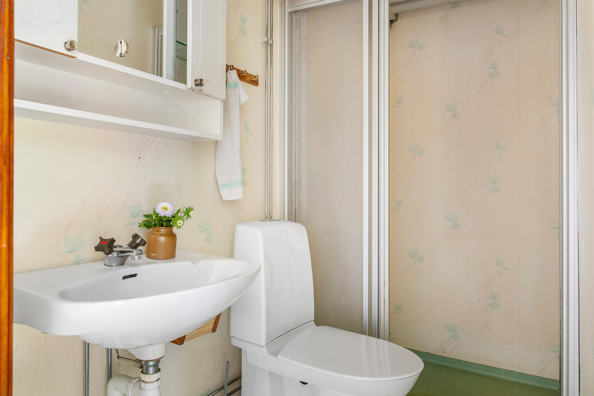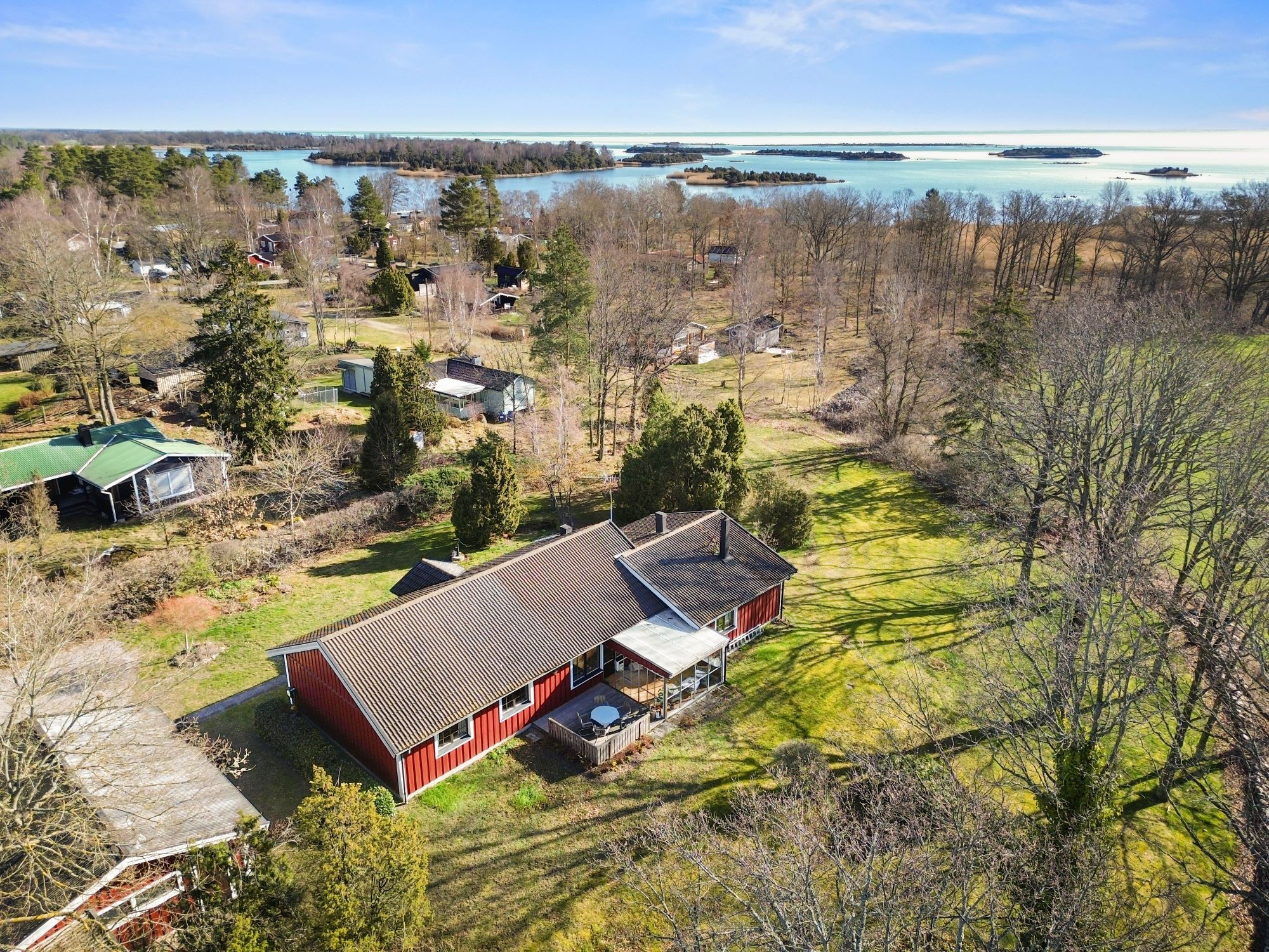 Alla utrymmen ligger på ett plan. I anslutning till vardagsrummet finns en rymlig inglasad veranda samt en terrass. På den stora tomten finns en vedeldad finsk bastu med plats för fyra till sex personer. Genom träden kan man upptäcka havet och lyssna på måsarnas sång.