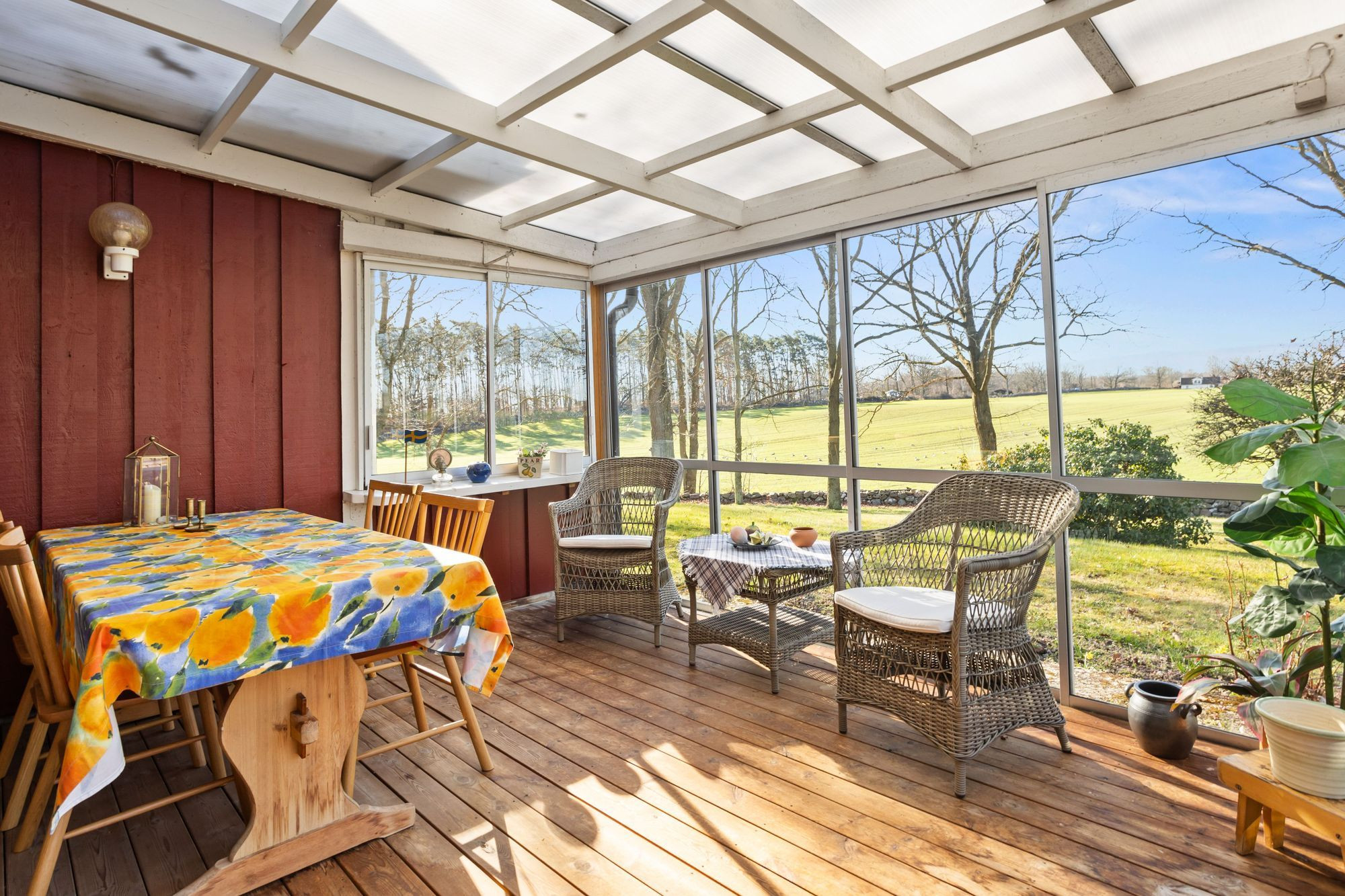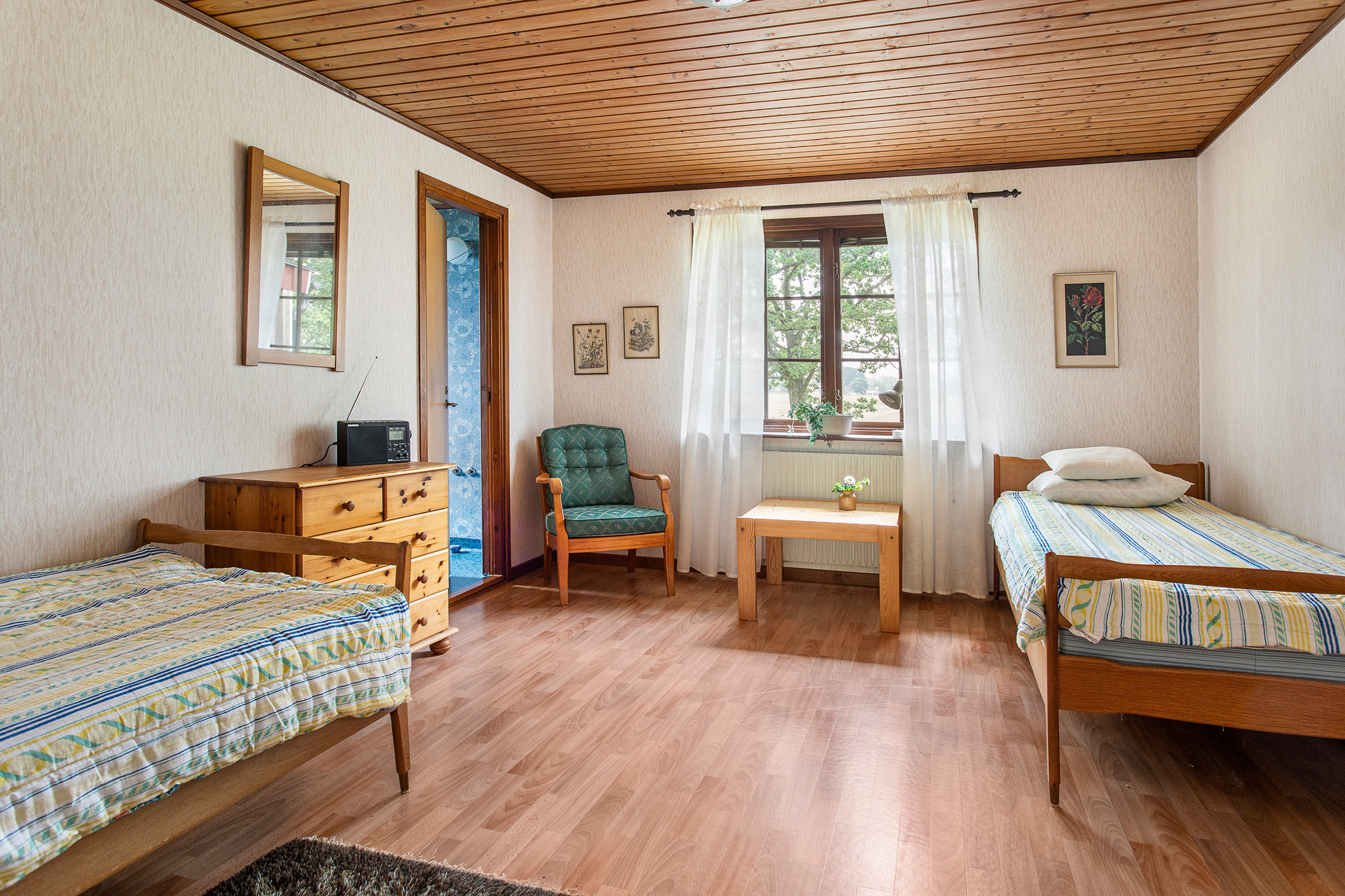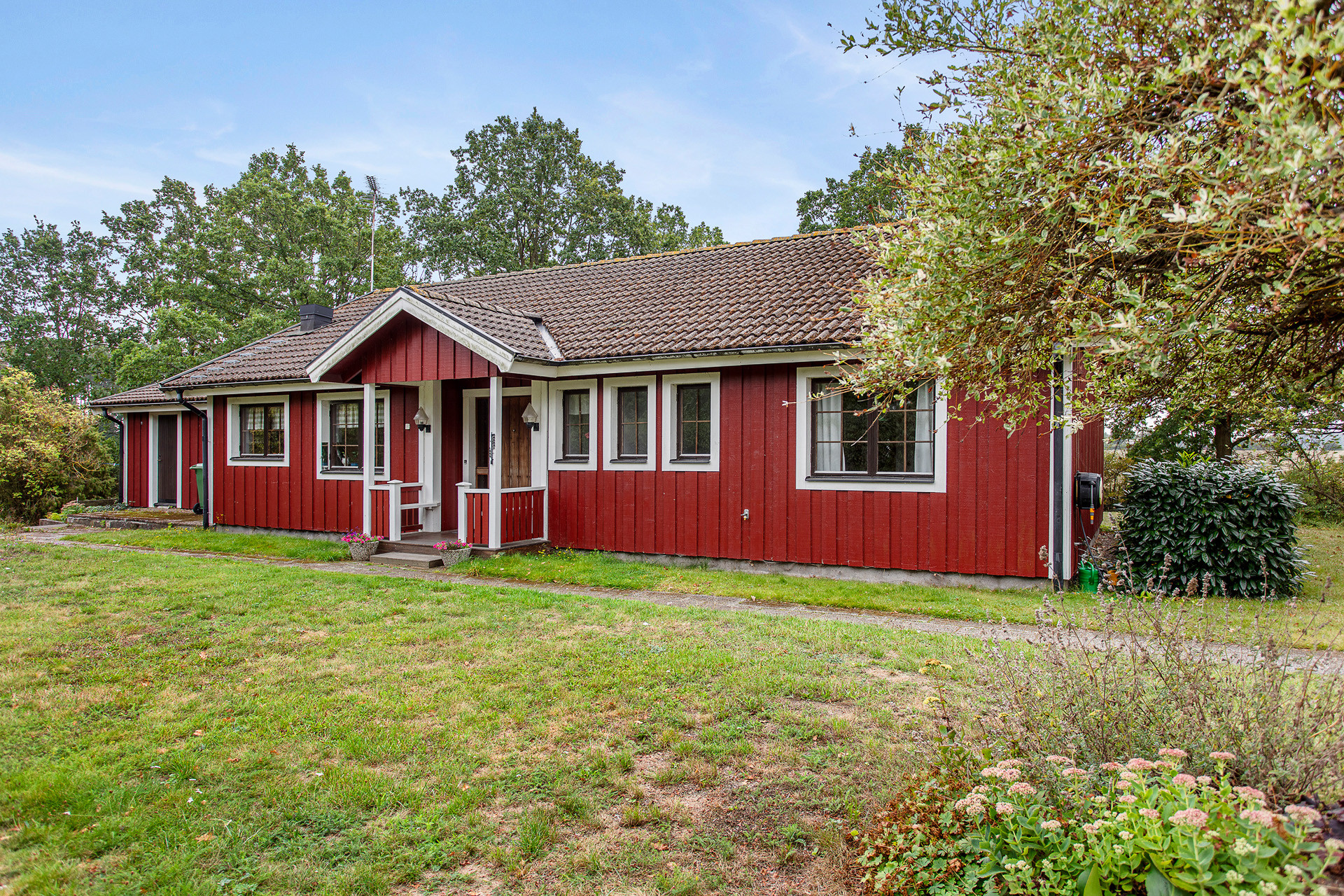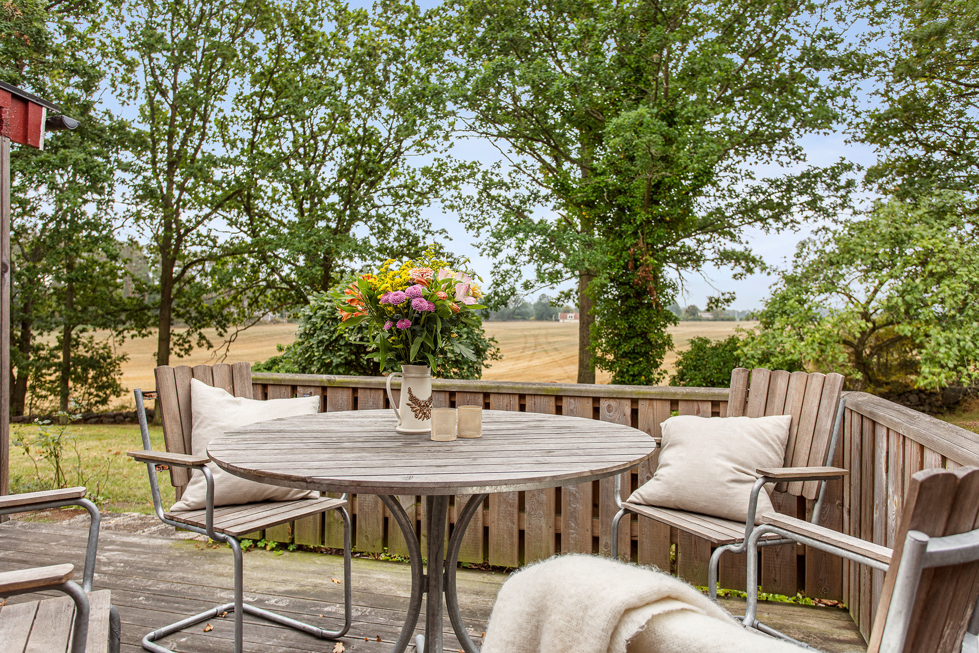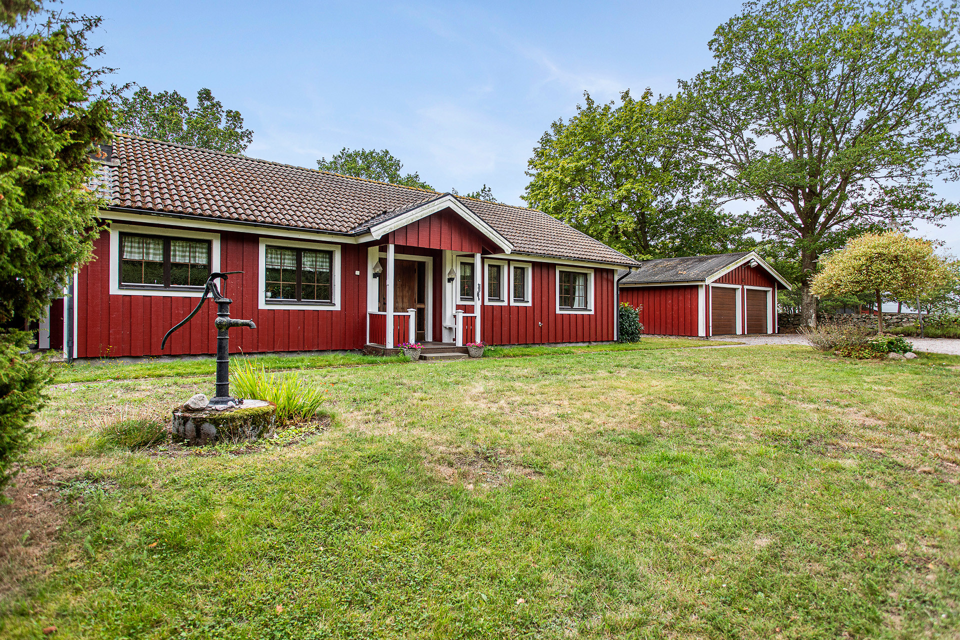På tomten finns även ett dubbelt garage samt två parkeringsplatser vid huset. Till huset kör man förbi en hästhage där man med lite tur kan bli hälsad av de stolta hästarna. Från terrassen ser man ut över ängar och åkrar, där det inte sällan dyker upp rådjur eller till och med någon enstaka älg.