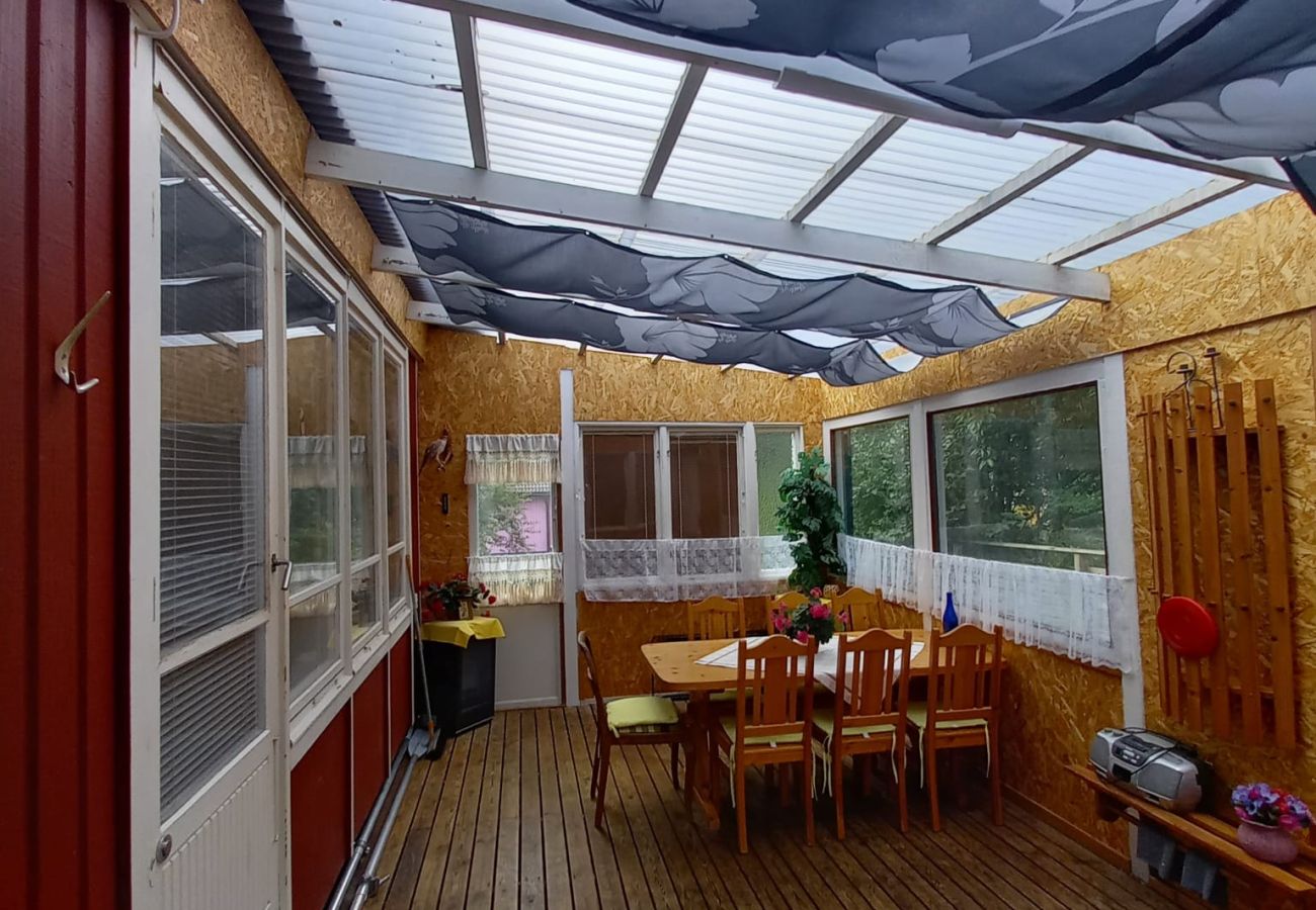 Detta semesterhus är en rustikal inredd, rött trähus.