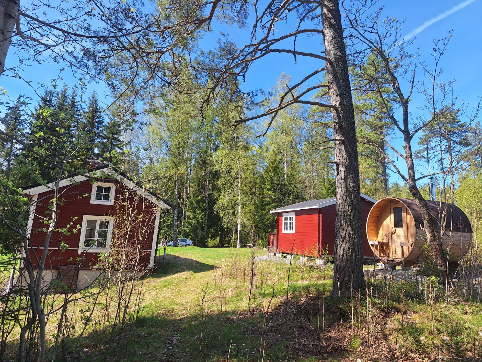 Alla byggnader stuga/gäststuga/toalett ligger mycket nära varandra.