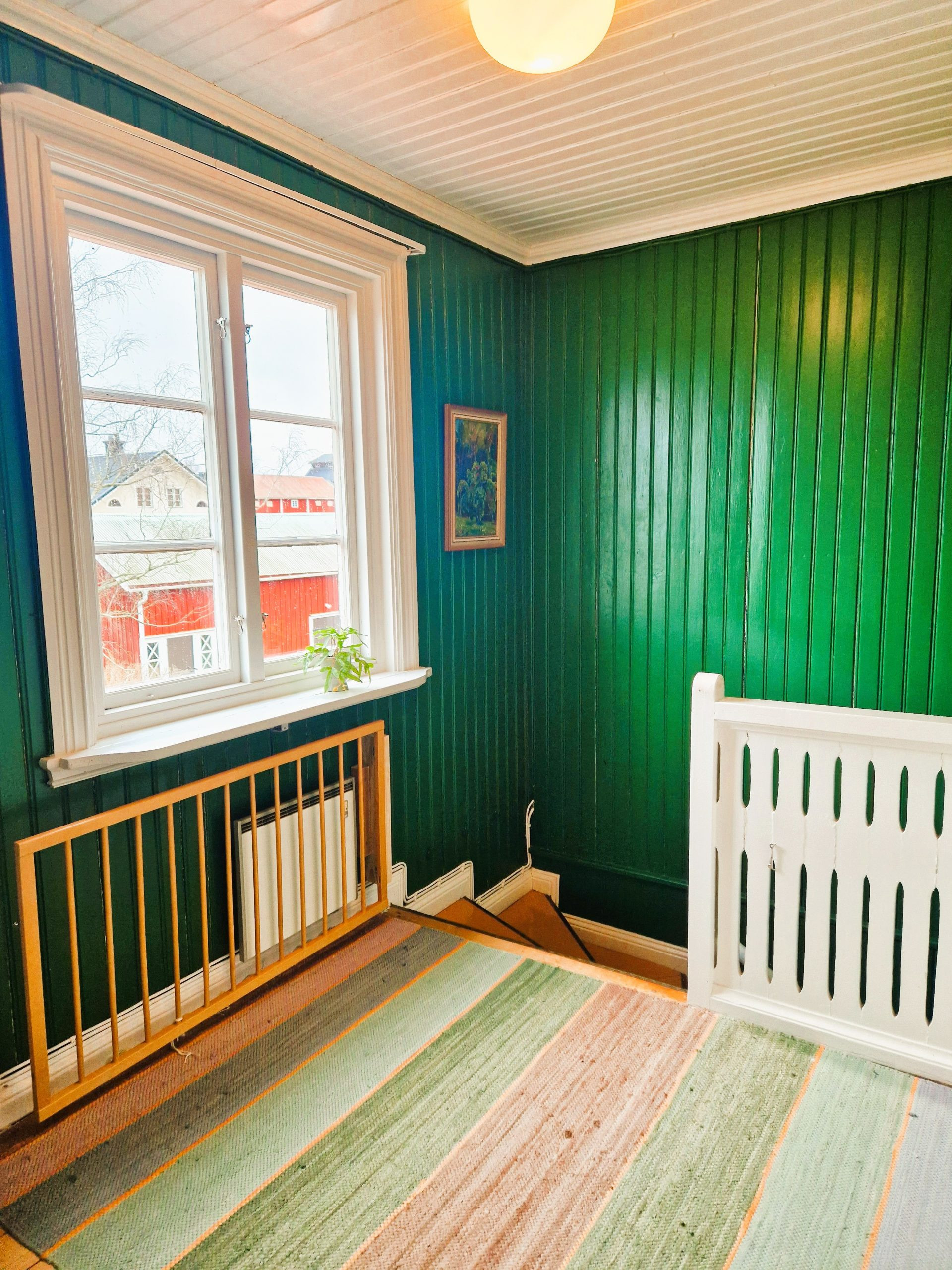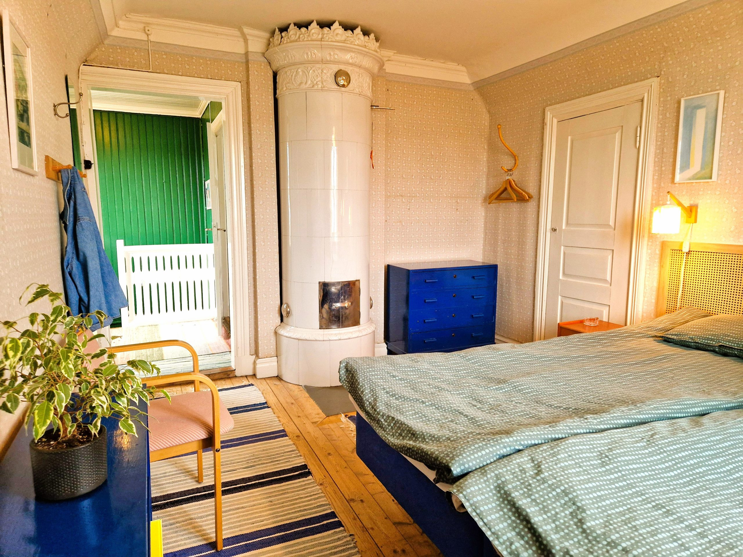 Övervåning med hall, ett mindre rum med utgång till balkong och två sovrum. Det ena sovrummet med dubbelsäng (180* 200, 2 enkla täcken) och det andra med två enkelsängar. I hallen mot balkongen finns en barnsäng 60*140 cm. En hopfällbar resesäng/spjälsäng finns också att låna.