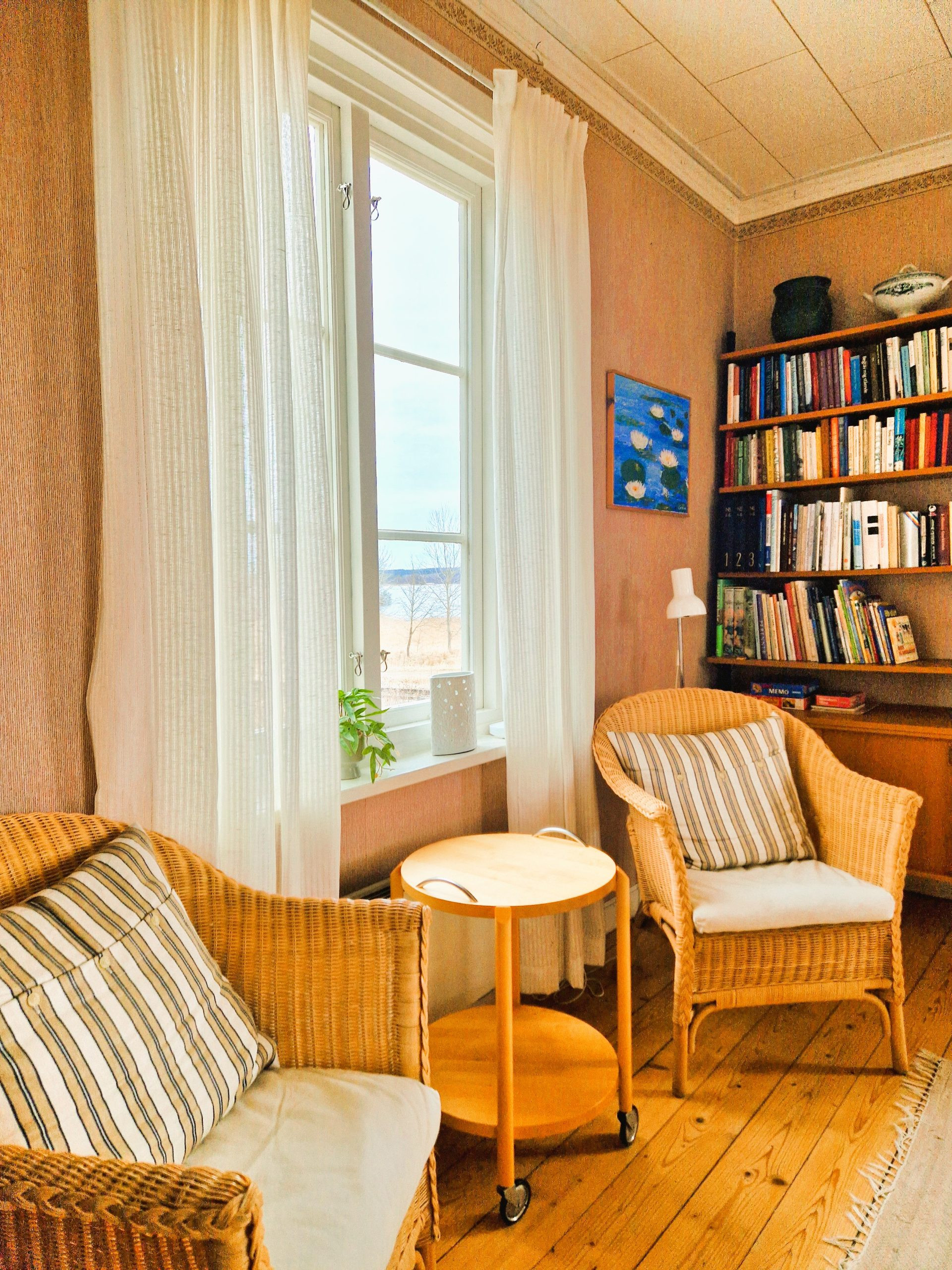 Rymligt vardagsrum och matrum. Barnstol och juniorstol finns. Från matrummet finns utgång till altan med söderläge och sjöutsikt.