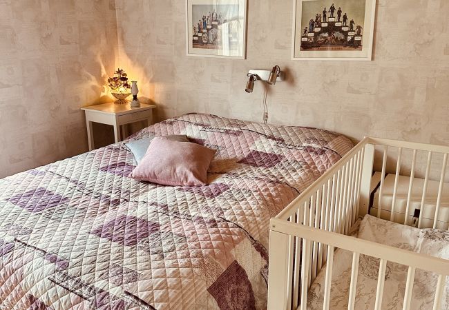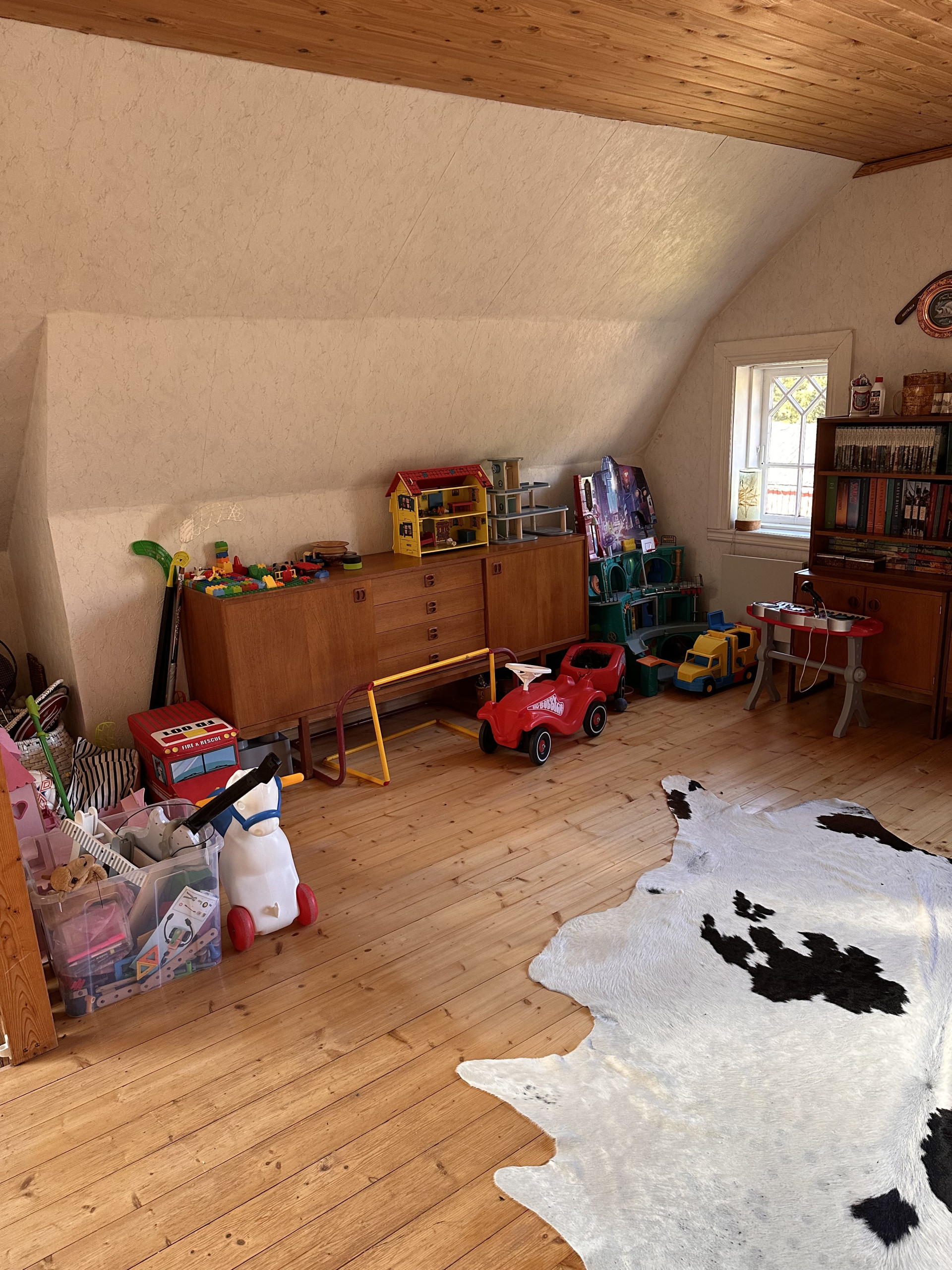 På ovanvåningen finns ett stort allrum med massa leksaker och en bäddsoffa för 2.