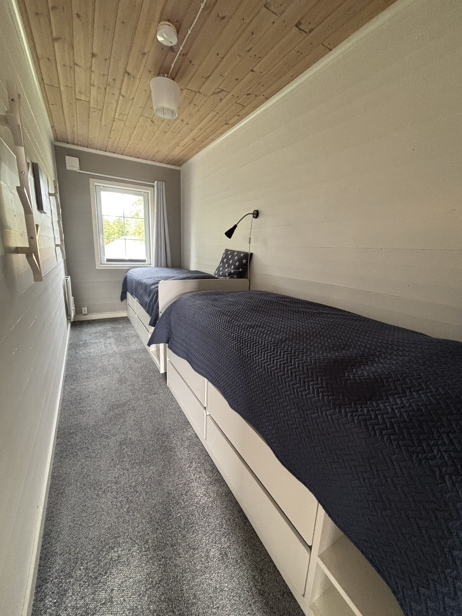 Stugan har wc & dusch, kök och öppen planlösning och öppet upp i nock samt 3 st sovrum (ett utav dessa är ett sovloft med dörr) med 2 st enkelsängar i varje sovrum + bäddsoffa med 2 bäddar i vardagsrummet. I stugan finns en spjälsäng och en barnstol. Köken är fullt utrustade med spis/ ugn, kyl/ frys, diskmaskin, micro, porslin, köksutrustning. TV med parabol och svenska kanaler finns i huset.