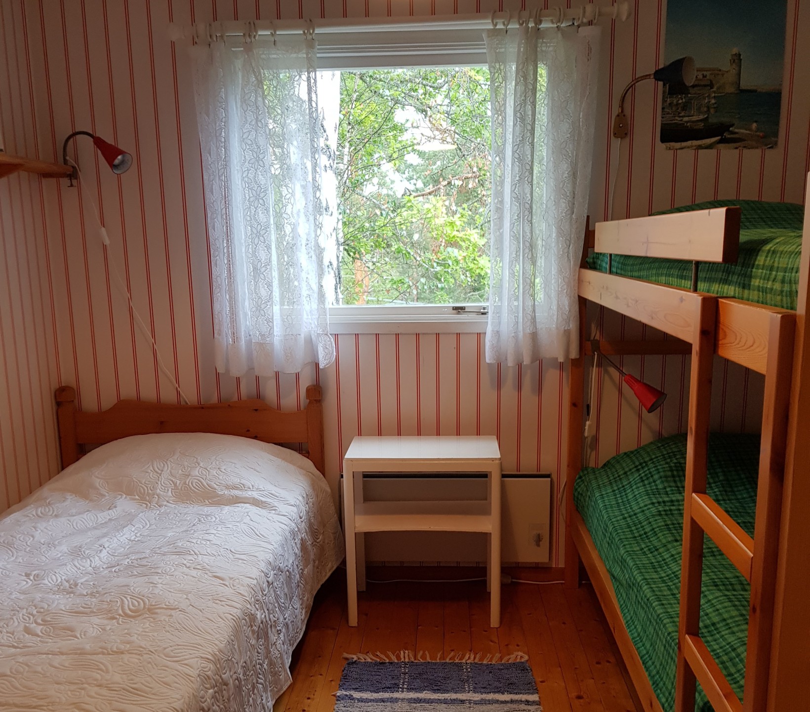 2 Sovrum (1. med två enkelsängar – kan stå tillsammans eller var för sig, 2. med våningssäng och enkelsäng). Extrabädd: Bäddsoffa finns i sällskapsrum, dock ej optimalt som sovutrymme.