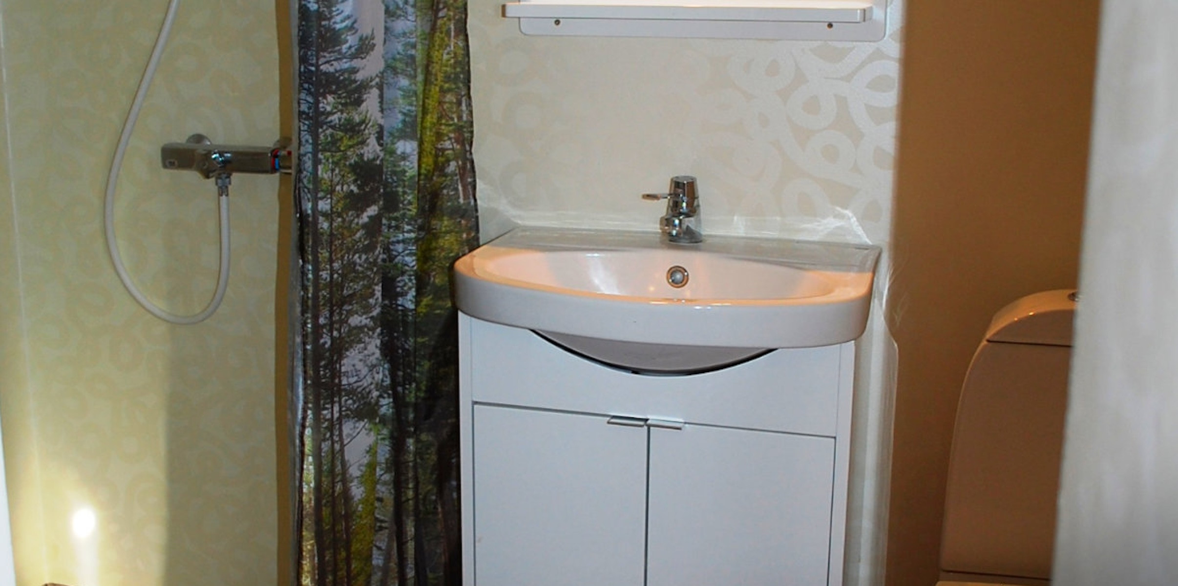 Nyrenoverat badrum med dusch, handfat och toalett. Golvvärme finns.