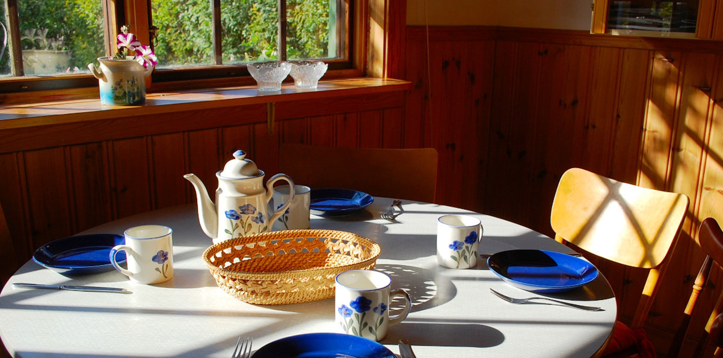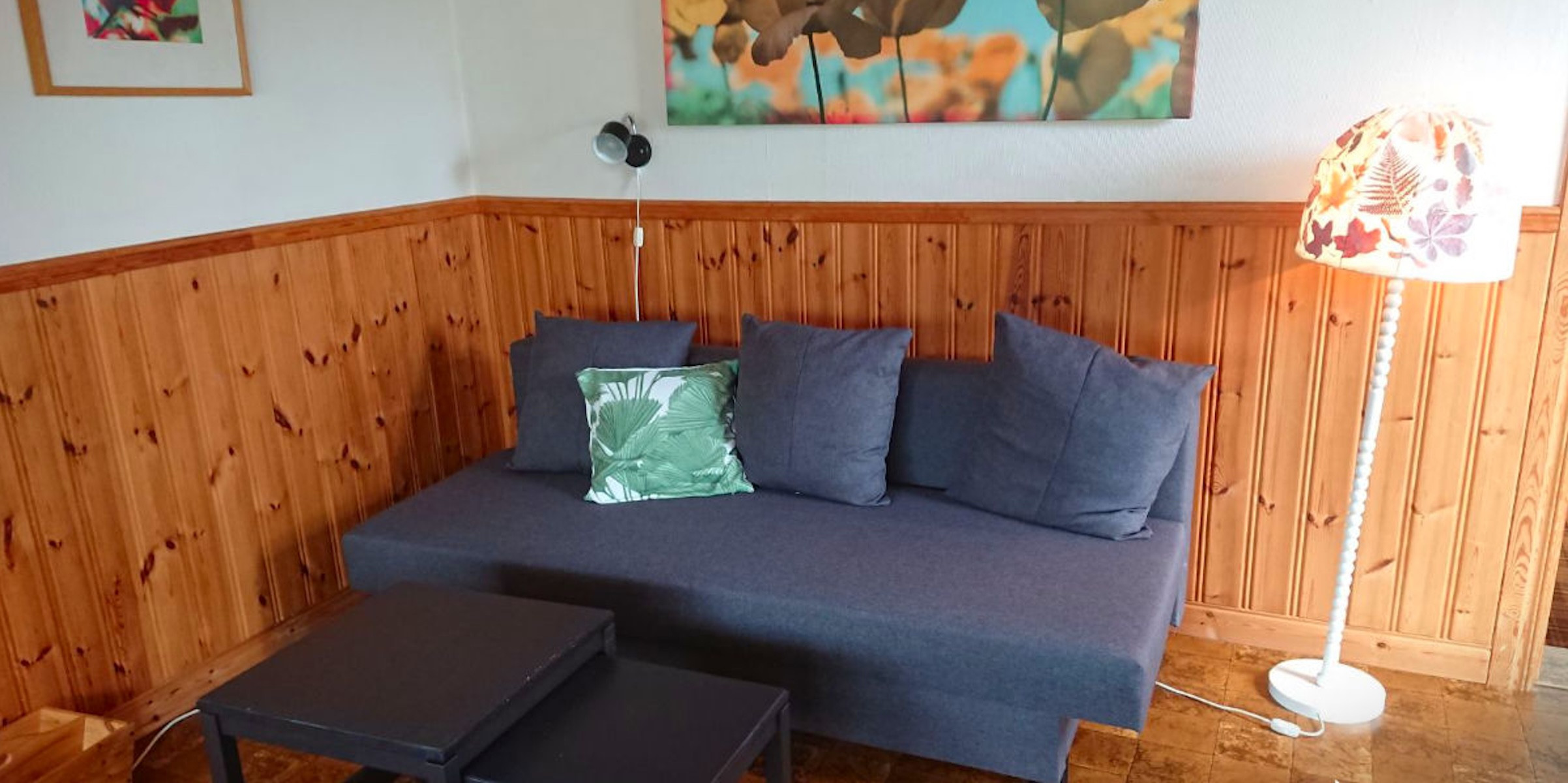 Vardagsrummet med kök är fullt utrustat med elektrisk spis, kylskåp, kaffebryggare och mikro. En fin matplats med utsikt över trädgården kompletterar vardagsrummet. Bäddsoffan (130 cm) ger sovplats för 2 pers/barn.